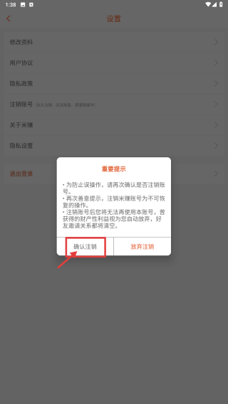 4、在重要提示弹窗里,点击确认注销按钮,完成账号注销操作。
