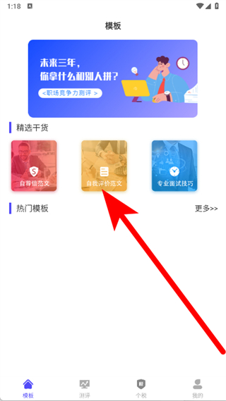 1、打开简历快制作,在模板页面,点击自我评价范文。