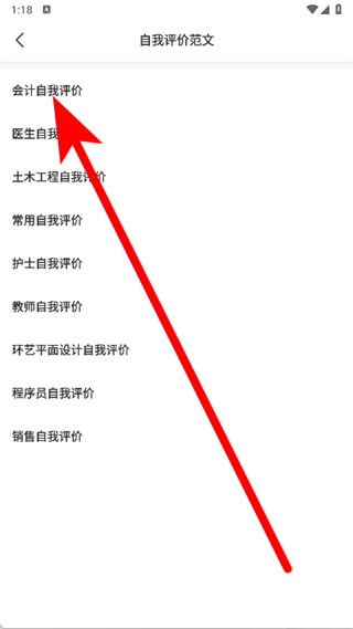 2、进入自我评价范文页面,点击会计自我评价。