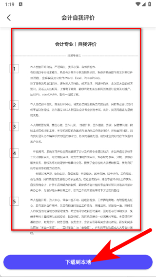 3、查看会计自我评价内容后,点击下载到本地。