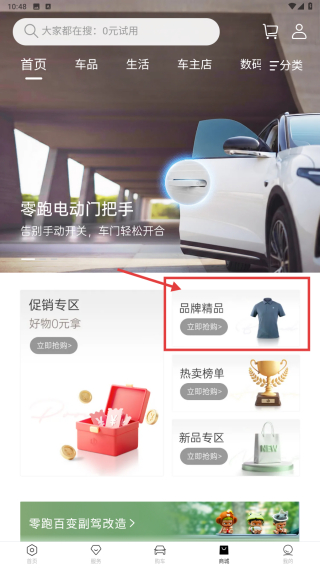 1、打开汽车类APP,点击底部商城选项,进入商城页面后,点击品牌精品区域,进入品牌精品馆页面。