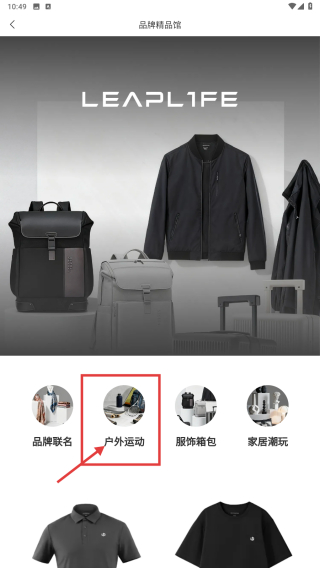 2、在商城页面,点击品牌精品分类,查看户外运动类商品列表。