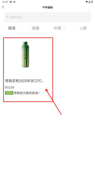4、在户外运动类商品列表中,点击零跑定制2025年浙江FC...商品条目,进入该商品详情页面,即可查看商品信息并进行购买操作。