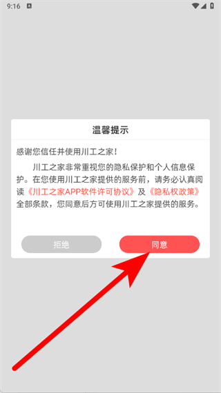 1、打开川工之家,在温馨提示弹窗中点击同意。