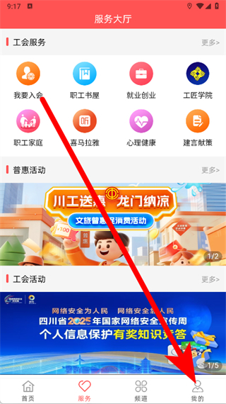 2、进入服务大厅后,点击底部导航栏的我的,进入个人页面。