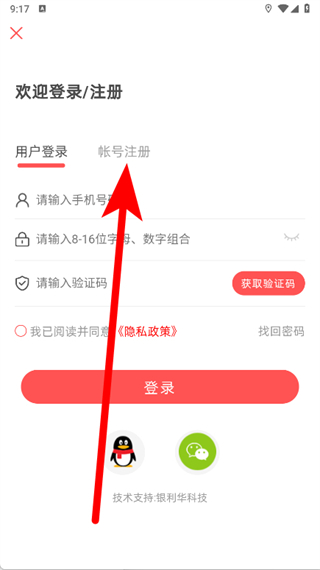 3、在欢迎登录注册页面,点击帐号注册选项,切换到注册界面。