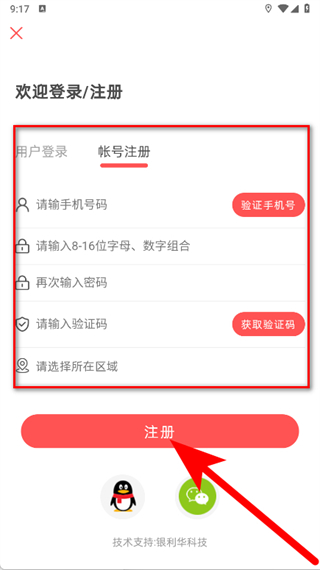 4、在帐号注册界面,依次填写手机号码等信息,点击注册按钮,完成账号注册。