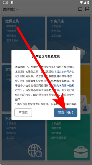 1、打开指尖水务,点击弹窗里的同意并继续。