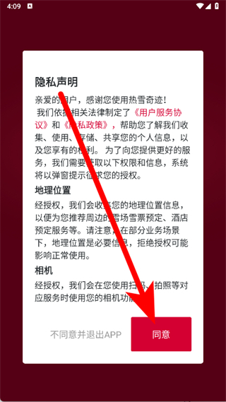 1、打开热雪奇迹,在弹出的隐私声明窗口中点击同意。