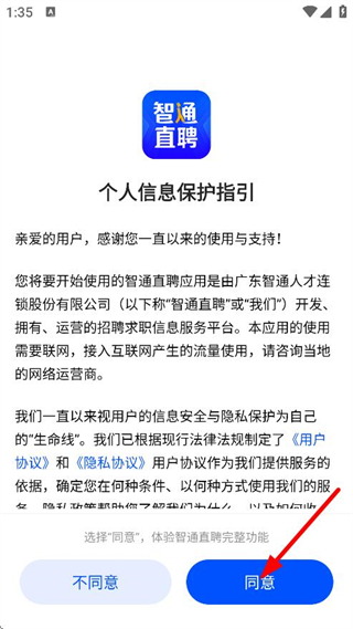 1、在智通直聘APP的个人信息保护指引页面,点击同意,进入登录页面。