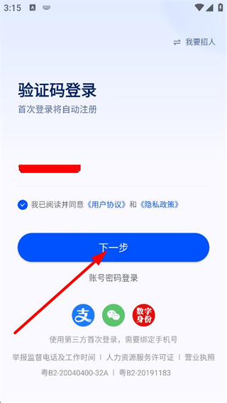 2、在验证码登录页面,输入手机号后点击下一步,进入输入短信验证码页面。