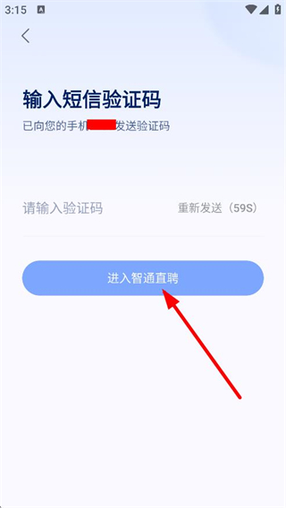 3、在输入短信验证码页面,输入收到的验证码后,点击进入智通直聘,完成登录操作。