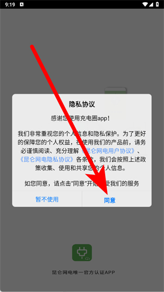 1、打开充电圈,在弹出的隐私协议弹窗里,点击同意按钮。