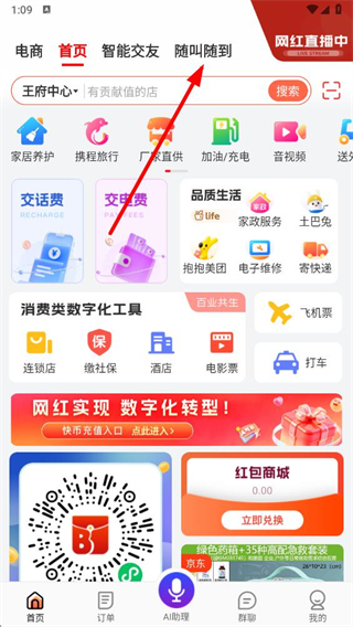1、打开嗖嗖app,点击顶部的随叫随到选项,进入相关页面。