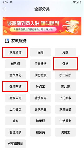 3、在全部分类页面的家政服务板块,根据个人需求选择家庭清洁、保洁、保洁阿姨等选项。