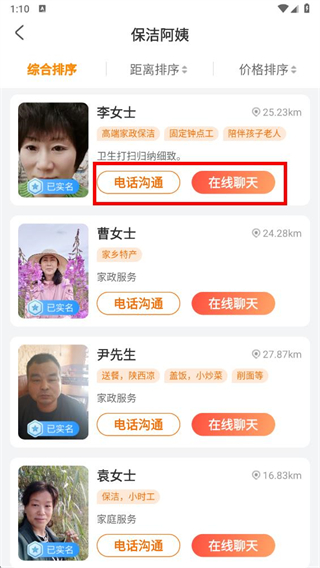 4、在保洁阿姨列表中,选择合适的阿姨,点击电话沟通或在线聊天进行咨询并下单。
