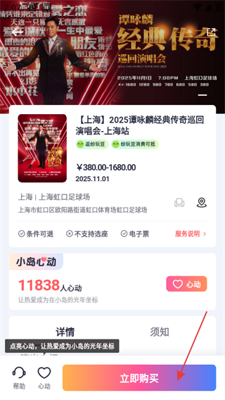 3、在演出详情页,点击立即购买,进入票品选择页面。
