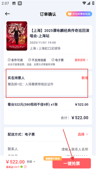 5、新增实名持票人,确认订单信息无误后,点击一键抢票,完成抢票操作。