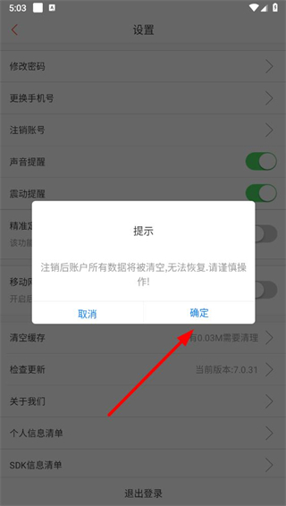 4、在弹出的提示框中,点击确定按钮,按照提示完成账号注销操作。