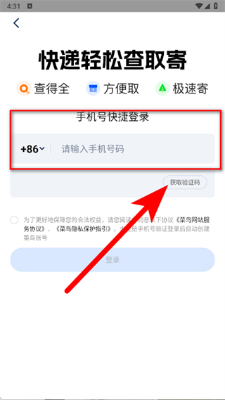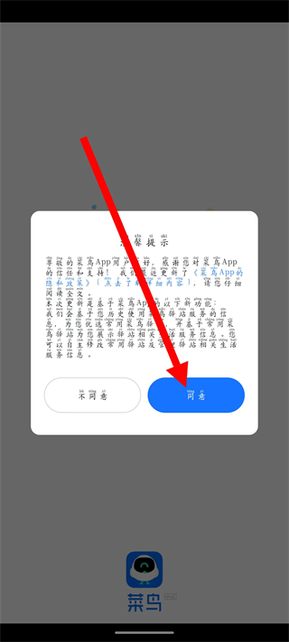 1、打开菜鸟裹裹,在弹出的隐私提示弹窗中点击同意。