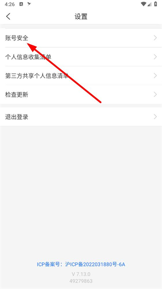 3、在设置页面,点击账号安全选项,进入账号安全页面。
