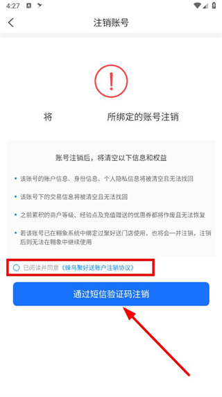 4、在账号安全页面,勾选已阅读并同意蜂鸟聚好送用户注销协议,通过短信验证码注销按钮,按照提示完成账号注销操作。