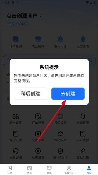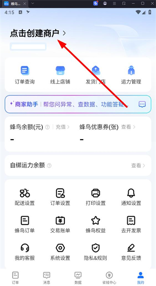 2、在我的页面顶部位置,找到并点击创建商户选项。
