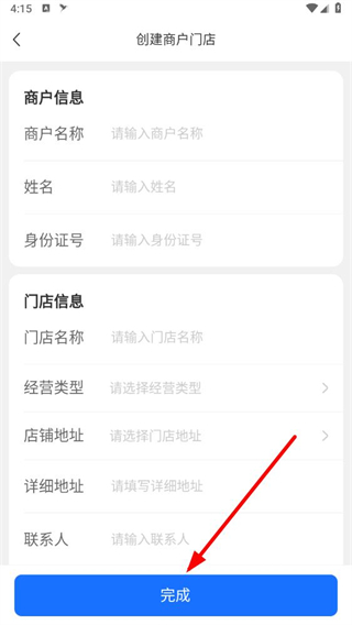 4、在创建商户门店页面,填写商户信息,完成后点击完成按钮,即可完成店铺创建操作。