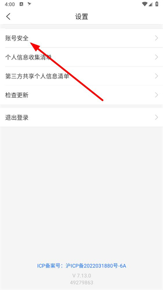 3、在设置页面,点击账号安全选项,进入账号安全页面。