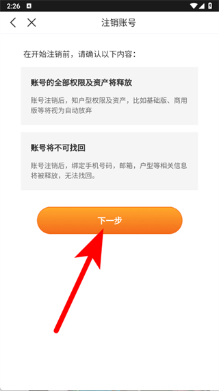 5、在注销账号页面,阅读账号注销相关提示后,点击下一步。