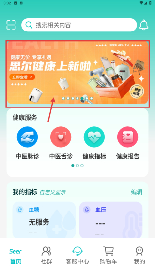 1、打开健康服务类应用,点击首页思尔健康上新啦banner,进入新品上新页面。