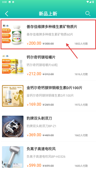2、在新品上新页面,选择目标商品如善存佳维牌多种维生素矿物质片,进入商品详情页。