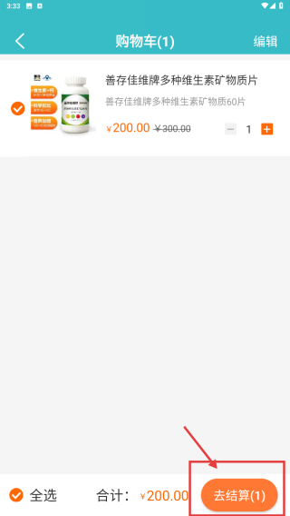 4、进入购物车页面,点击去结算按钮,按提示完成商品购买操作。