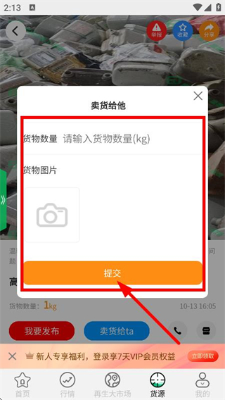 4、输入货物数量、添加货物图片后,点击提交,完成卖货操作。