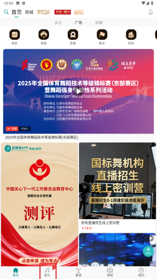 1、打开舞蹈类应用,点击底部音乐选项,进入音乐板块。