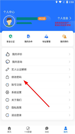 2、在个人中心页面,点击修改密码选项,进入修改密码页面。