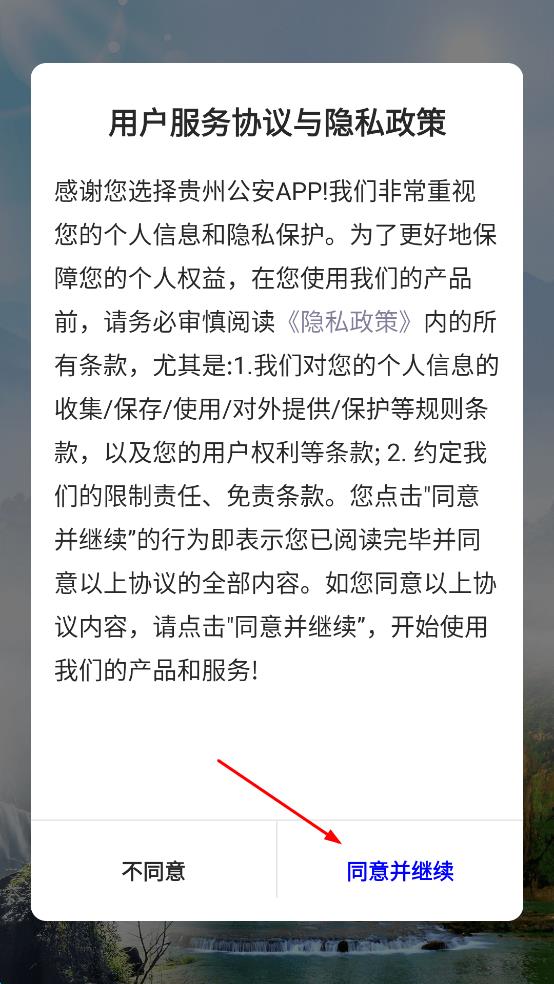 1、打开贵州公安APP,在弹出的用户服务协议与隐私政策提示框中,点击“同意并继续”,进入APP主界面。