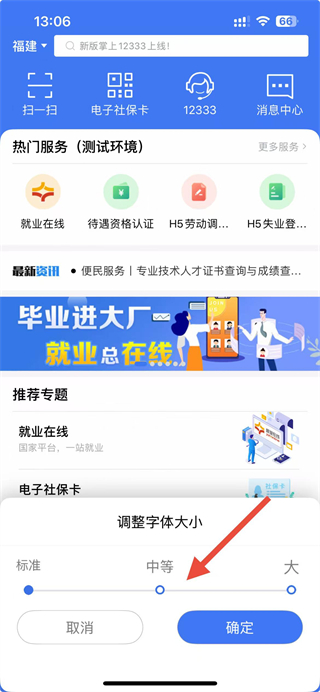 4、在字体大小调整页面,拖动滑块选择合适的字体大小,点击确定按钮,完成字体大小设置操作。