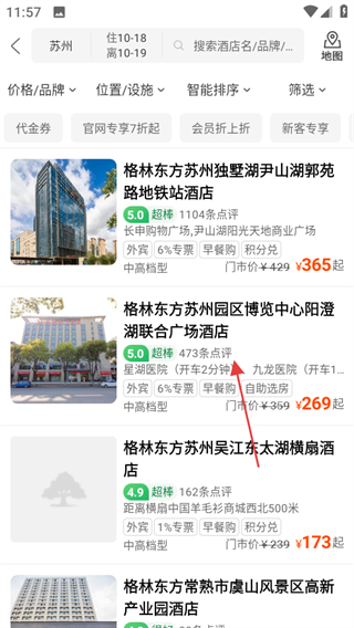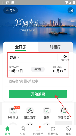 1、进入格林豪泰酒店,在首页设置信息后,点击开始搜索,进入酒店列表页面。