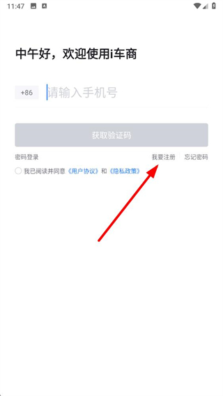 1、打开i车商app,在登录界面点击我要注册选项进入注册页面。