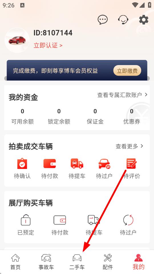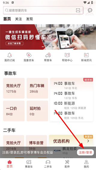 1、打开博车网拍卖应用,点击底部导航栏中的二手车选项。