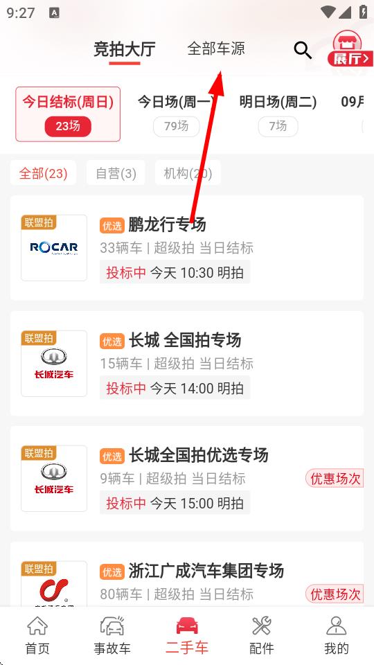 2、进入二手车页面后,点击上方的全部车源,浏览展示的车源列表。