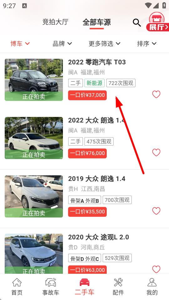 3、在车源列表中,每辆车源信息下方会显示一口价标签,点击进入详情页。