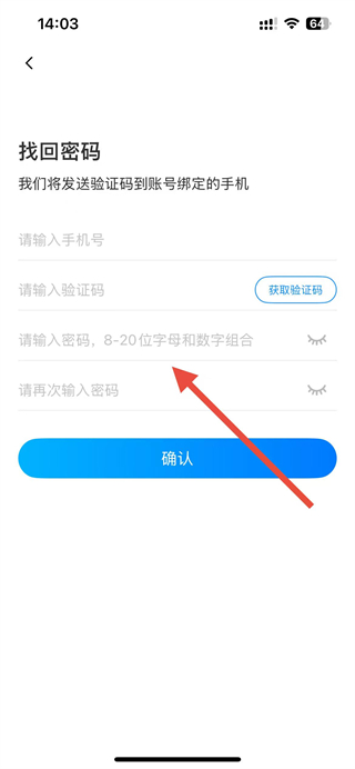 4、在找回密码页面,依次输入手机号、获取并输入验证码,设置新密码,点击确认完成密码找回。