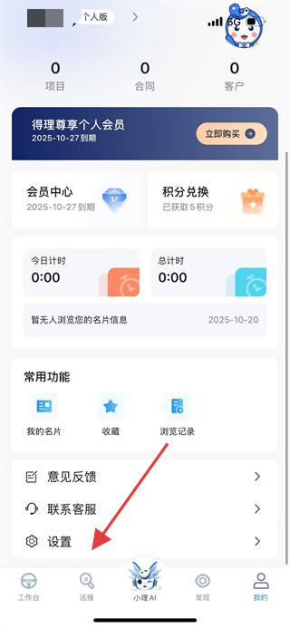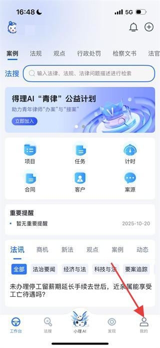 1、进入得理法搜,在工作台页面点击底部我的,进入个人页面。