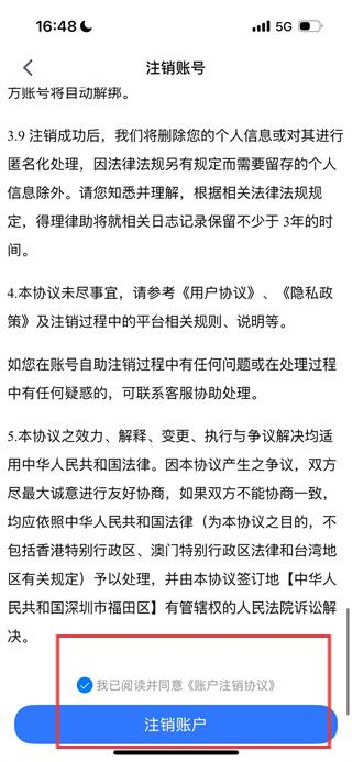 4、在注销账号页面,同意协议后,点击注销账户,即可注销账号。
