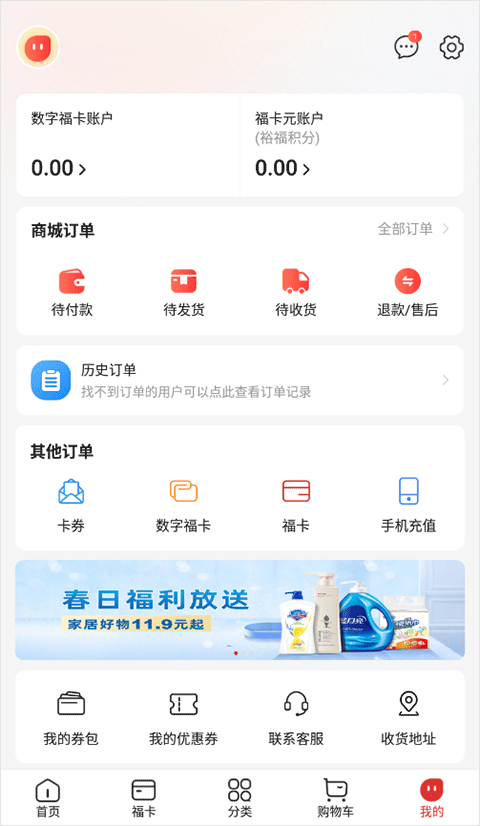 1、首先打开福卡商城app,在我的功能,点击副卡账户;