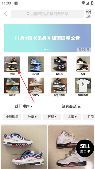 1、进入nice球鞋首页,点击二手,进入二手商品相关页面。