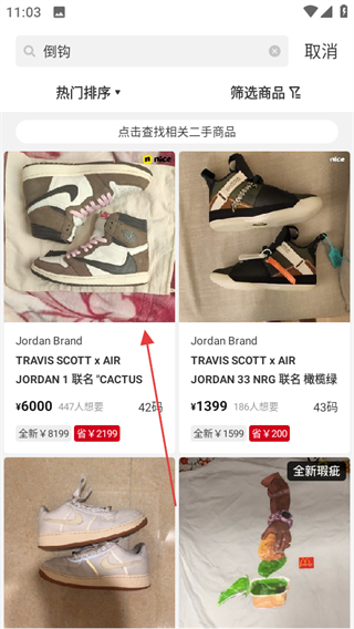 2、在二手商品页面,点击倒钩,进入倒钩商品列表页面。