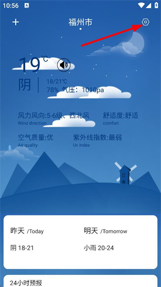 1、在天气显示页面,点击右上角设置图标,进入设置页面。